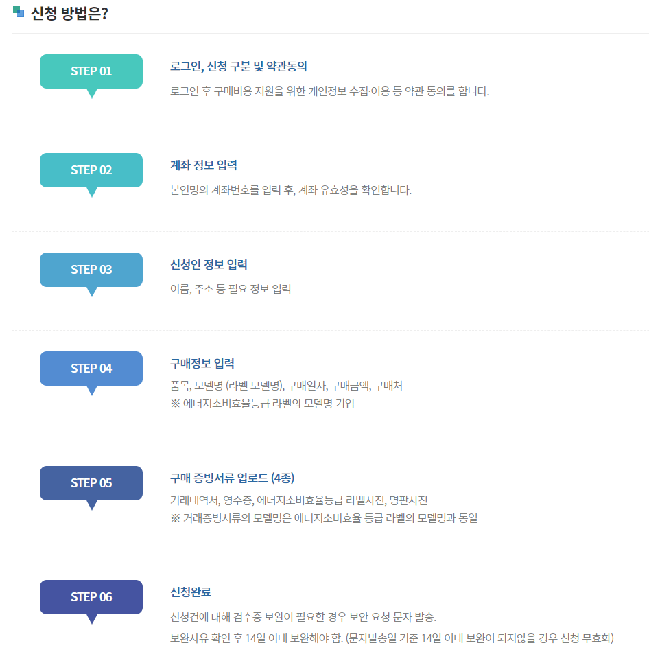 고효율 가전제품 구매비용 지원 신청방법은 한국전력공사 사이트 로그인후 계좌정보 입력 후 신청인 정보를 입력합니다. 신청인 정보 확인 후 구매한 품목의 정보 등을 입력한 뒤, 구매 증빙서류를 업로드하면 신청이 완료됩니다. 신청 완료건에 대해 심사 후 보완이 필요할 경우 별도의 연락이 가며 14일 이내 보완을 해야 합니다.